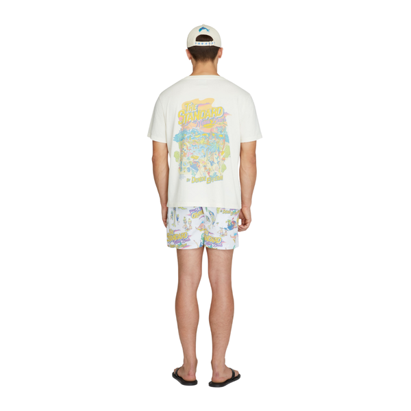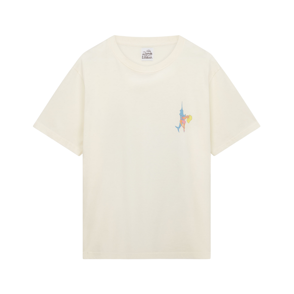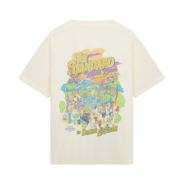 A soft essential with a playful twist. This carbon-washed jersey tee features a minimalist dancing swordfish illustration at the heart and a bold Donde Esteban x The Standard placed graphic across the back. With its light cream hue and classic regular fit, it’s a nod to effortless summer dressing — equal parts comfort and character.